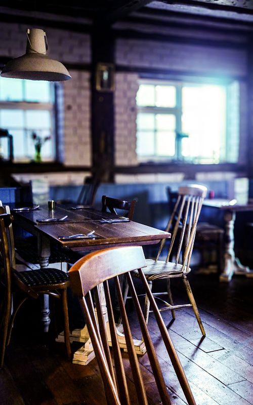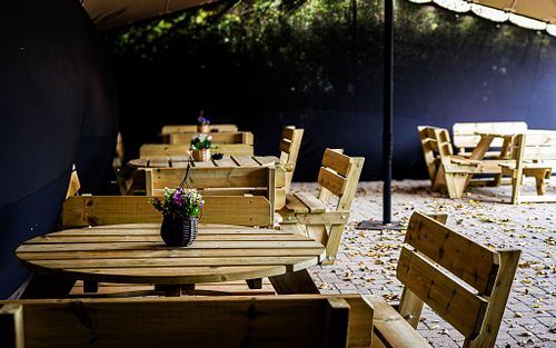 Round the back, our large all-weather stretch-tent garden offers a bright, open, and beautifully sheltered space with solid wooden tables and benches. Fairy lights, rustic barrels, crisp paving and leafy touches set the scene for relaxed afternoons and cosy evenings — rain or shine.